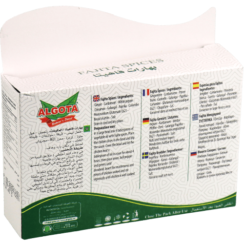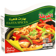 بهارات الفاهيتا من الغوطة خلطة توابل على الطريقة المكسيكية تضيف نكهة مدخنة وحارة بشكل معتدل لقطع الدجاج أو اللحم، مثالية للفاهيتا في الساندويشات أو على الشواية أو المقلاة.