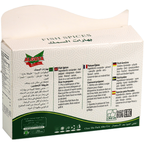 بهارات السمك من الغوطة خلطة عطرية مخصصة لتتبيل الأسماك تضفي نكهة طازجة مع حرارة خفيفة ولمسة حمضية عند استخدامها للشوي أو القلي أو الفرن.