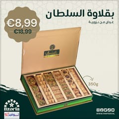 أسئلة شائعة وإجاباتها: ما أفضل بقلاوة صغيرة للهدايا؟ بقلاوة مشكلة السلطان 350غ لأنها علبة معدنية أنيقة وسهلة التقديم. شو أقدم مع القهوة العربية؟ بقلاوة مشكلة السلطان 350غ لأنها مشكلة وطعمها متوازن. بدي حلويات مشكلة تكفي ضيافة خفيفة؟ بقلاوة مشكلة السلطان 350غ مناسبة لضيافة سريعة. هل فيها مكسرات؟ نعم، محشوة بالفستق والكاجو. بدي خيار يرضي أكثر من ذوق؟ بقلاوة مشكلة السلطان 350غ لأنها تشكيلة متنوعة.