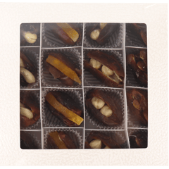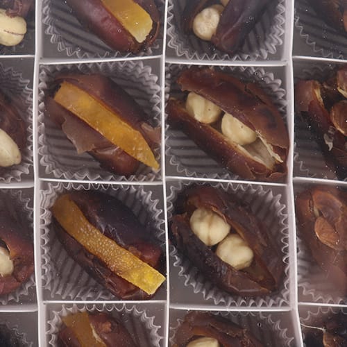 علبة أنيقة من التمر الطري المحشي بالمكسرات المقرمشة وشرائح قشر البرتقال المسكّر، بطعم متوازن بين حلاوة التمر ونكهة المكسرات والحمضيات، مثالية للضيافة أو كهدية