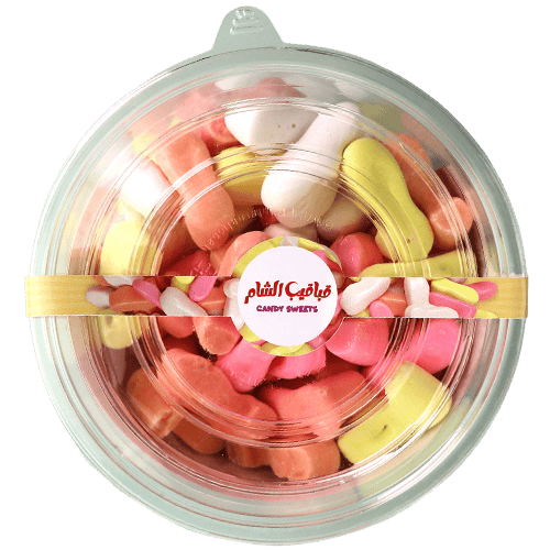 حلويات سورية ملونة بطعم الفواكه على شكل قباقيب تقليدية، حلال ومصنوعة في سوريا. تأتي بألوان مبهجة منها الوردي والأصفر والأبيض والبرتقالي. مثالية للمشاركة مع العائلة. المكونات الأساسية: سكر، شراب الجلوكوز، جيلاتين، نكهات فواكه، ألوان طبيعية.