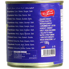 ذرة حلوة حب جاهزة للاستخدام، مناسبة للسلطات والطبخ السريع. المكونات: ذرة، ماء، سكر، ملح. الوزن بعد التصفية: 180غ.