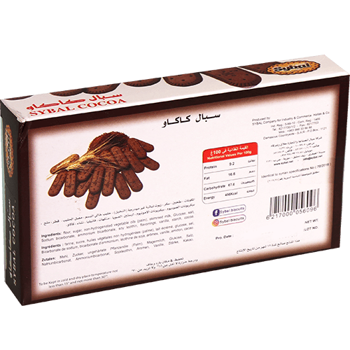 بسكويت الكاكاو اللذيذ من سيبال بنكهة الشوكولاتة الغنية وقوام هش. مثالي للتسالي أو مع الشاي والقهوة. المكونات الأساسية: دقيق القمح، سكر، مسحوق الكاكاو، زيت نباتي، ملح.