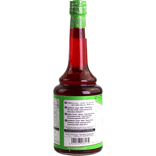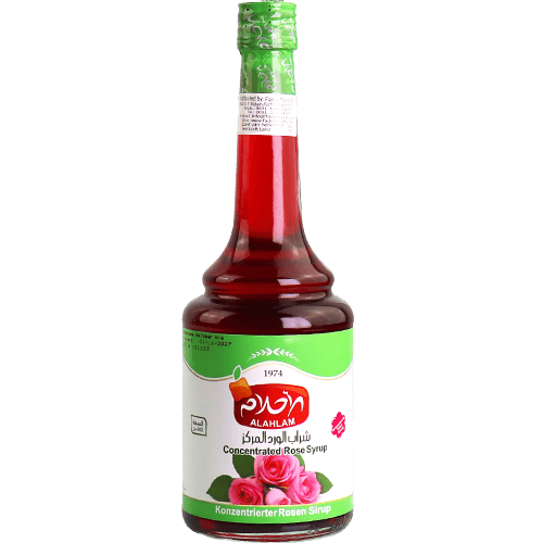 شراب ورد مركز بنكهة ورد عطرية ولون وردي/أحمر مميز، يُخفف بالماء لعمل شراب ورد سريع، ويُستخدم أيضاً للحلويات والمشروبات الباردة.