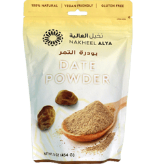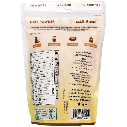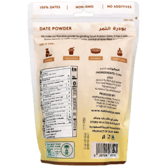 بودرة التمر الطبيعية المصنوعة من تمر سعودي عالي الجودة، تستخدم كمحلي صحي في العصائر، الحلويات، الصلصات والسموذي، وتتميز بنكهة غنية وقوام ناعم وخالية من الإضافات والجلوتين وغير معدلة وراثياً.