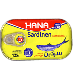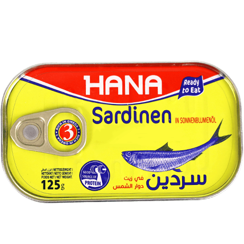 سردين معلب جاهز للأكل محفوظ في زيت دوار الشمس الخفيف، غني بالبروتين وأحماض أوميغا 3 الدهنية ومناسب للسندويشات والسلطات والوجبات السريعة. المكونات الأساسية (المتوقعة لهذا المنتج): سردين، زيت دوار الشمس، ملح.