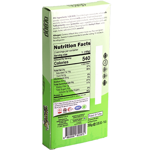 شوكولا فاخرة مستوحاة من حلوى دبي الشهيرة بالفستق. تجمع هذه الشوكولا بين الشوكولا البيضاء الكريمية وحشوة كريمة الفستق الغنية مع طبقة مقرمشة من الكنافة (الكنافة الشعر). تعطي لون الماتشا المميز وشكلها الفاخر تجربة طعم فريدة لمحبي الشوكولا والحلويات الشرقية.