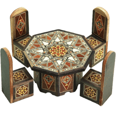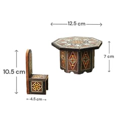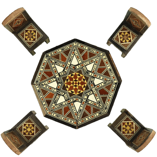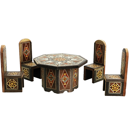 مجسم طاولة صغيرة مع أربع كراسي بتصميم موزاييك/تطعيم هندسي شرقي، بقياس يقارب 12.5 سم، مثالي لوضعه على الرف أو المكتب أو في واجهة المحل كديكور تراثي لطيف.