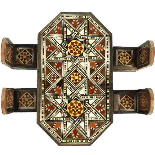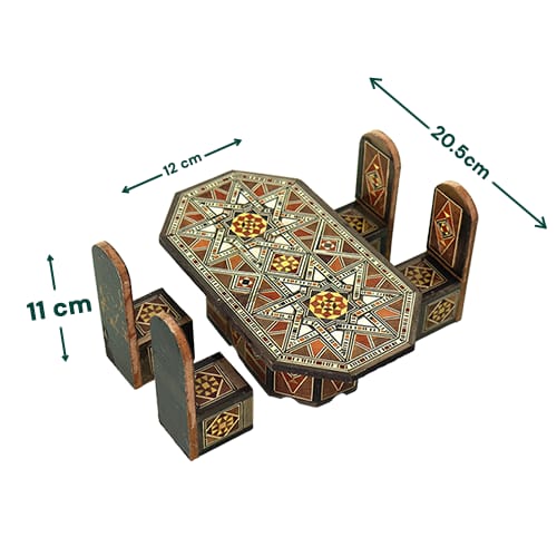 مجسم ديكوري صغير عبارة عن طاولة وأربع كراسي بتصميم موازييك/تطعيم هندسي شرقي، مناسب للرفوف والمكاتب وديكور المحلات والهدية المميزة لعشاق التراث.