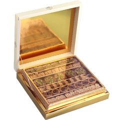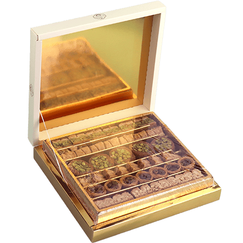 تشكيلة بقلاوة فاخرة ضمن علبة هدايا، طبقات مقرمشة ومحشية بمكسرات مثل الفستق والكاجو ومناسبة للضيافة مع القهوة أو الشاي.