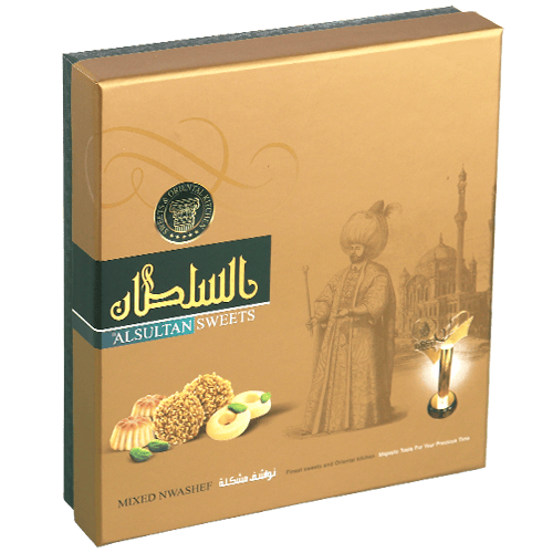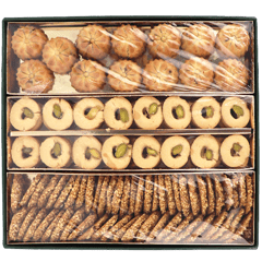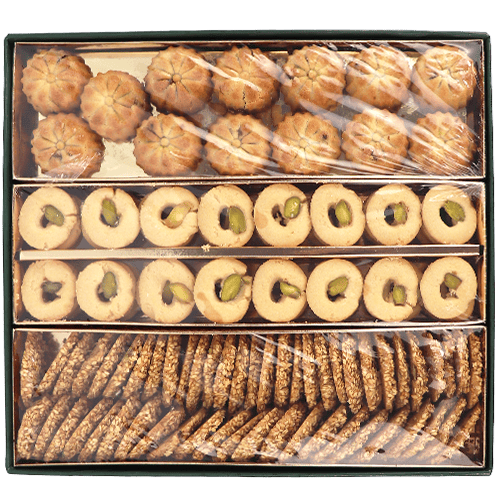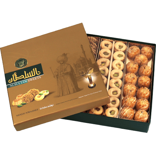 علبة نواشف مشكلة مرتبة للتقديم؛ تشكيلة نواشف شرقية مثل معمول تمر وبرازق بالسمسم وغريبة (غالباً مزينة بالفستق)، مناسبة للضيافة والزيارات والهدية.