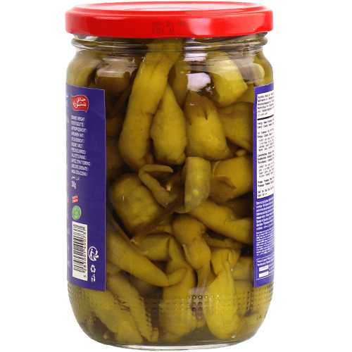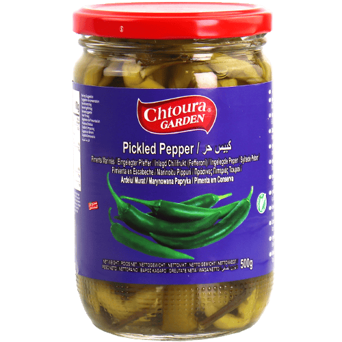مخلل فليفلة حارة بمرطبان 500غ، طعمه حامض ولاذع ويقدّم كمقبلات/مخلل جنب الأكل.
