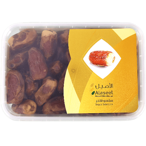 تشكيلة تمر صقعي فاخرة من الأصيل، حبات متوسطة الحجم ذات طرف ذهبي متماسك وجسم بني طري، بطعم حلو خفيف وقوام يمزج بين القرمشة والليونة، مثالية كوجبة خفيفة يومية أو للتقديم مع القهوة.