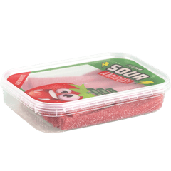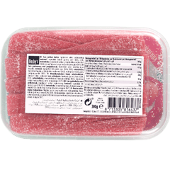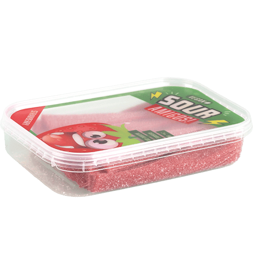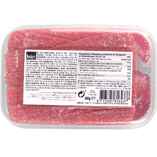 حلوى جيلي نباتية بنكهة الفراولة الحامضة على شكل شرائط من بيكيز. حلال ومعتمدة بألوان طبيعية وطبقة حامضة لاذعة. قوام ممتع ومطاطي في علبة قابلة لإعادة الاستخدام، مثالية لمحبي الحلويات الحامضة. المكونات الأساسية: شراب الجلوكوز، سكر، بديل الجيلاتين، حمض (حمض الستريك)، نكهة الفراولة الطبيعية وألوان.