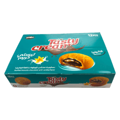 بسكويت تيستي كريم من إنتاج مكي محشو بشوكولا بنكهة الفانيليا. العبوة فيها 12 قطعة. المكونات الأساسية: دقيق القمح، زيوت نباتية، سكر، كاكاو، شوكولا، نكهة الفانيليا.