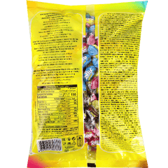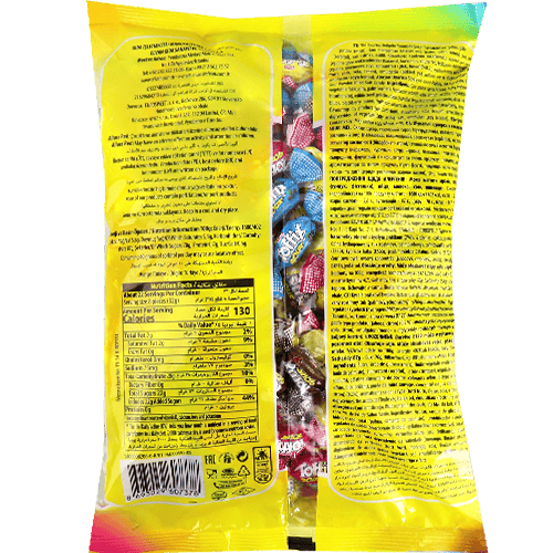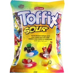 حلوى طرية ومضغية بحشوة بودرة حامضة بنكهات مشكلة (فراولة، ليمون، توت/بلاك بيري، كولا) وكل قطعة مغلفة بشكل فردي.