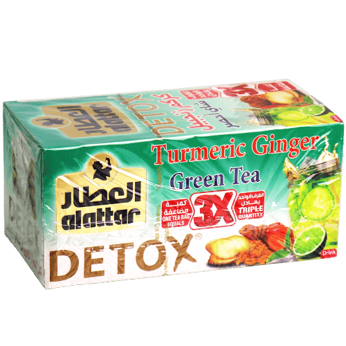 خلطة ديتوكس من العطار ضمن 24 ظرف، تجمع بين الشاي الأخضر والكركم والزنجبيل بطعم عطري وقوي، وتُشرب كمشروب دافئ.