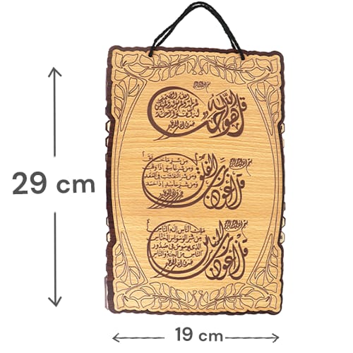 تعليقة ديكور خشبية بنقش خط عربي إسلامي (المعوذات) مع حبل للتعليق، مقاس تقريبي 29×19 سم، مناسبة للبيت والمكتب وزاوية الصلاة وتعطي لمسة روحانية جميلة.