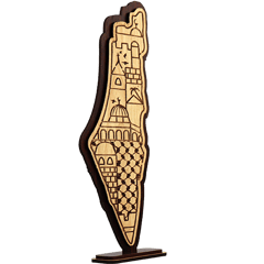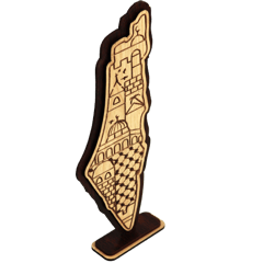 قطعة ديكور خشبية على شكل خريطة فلسطين مع نقش جميل وقاعدة ثابتة للعرض.