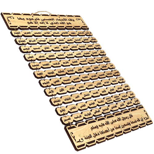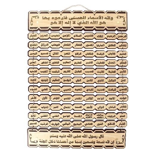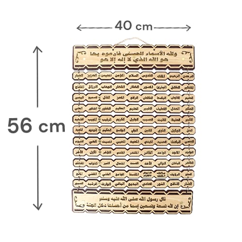 لوحة ديكور خشبية تحمل أسماء الله الحسنى بخط عربي ضمن إطار مزخرف، مقاس تقريبي 56×40 سم، مناسبة لتعليقها في غرفة الجلوس أو المدخل أو زاوية الصلاة، وتعتبر هدية مميزة للأهل والأصدقاء.