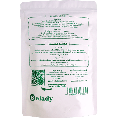 بودرة سدر يمني بلادي هي مسحوق طبيعي خالص مستخلص من أوراق شجرة السدر اليمنية المجففة والمطحونة، تشتهر بجودتها العالية وفعاليتها المتميزة في العناية بالشعر. يُستخدم السدر اليمني منذ القدم كشامبو طبيعي ومقوٍ للشعر وفروة الرأس، وهو خالٍ تماماً من المواد الكيميائية الضارة.